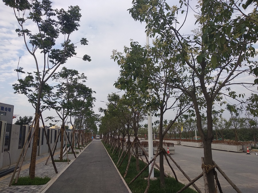 周公大道监理组根据图纸设计及施工规范,在现场绿化施工时,对绿化公司企业资质,项目负责人和重要岗位人员资质进行了审查,并严格检测进场植被的进场资料和现场实测进场树苗。