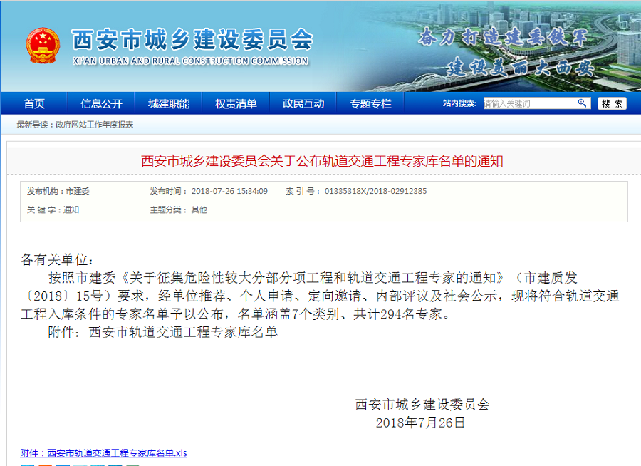 西安市建委于2018年6月进行了危险性较大分部分项工程和轨道交通工程专家征集工作,7月份进行了广泛评审及社会公示,7月底西安市建委将符合入库条件的专家名单正式向社会对外公布。