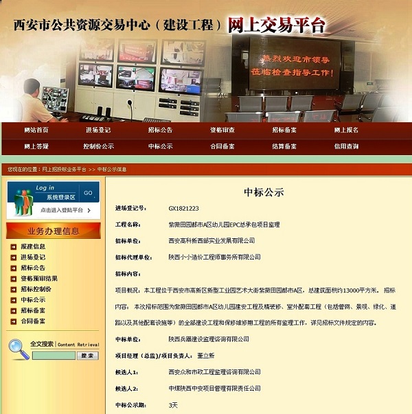 近日,在西安高科新西部实业发展有限公司组织实施的“紫薇田园都市A区幼儿园EPC总承包项目监理”招投标活动中,我公司一举中标。本项目工程概算约5508万元;建筑面积约13000平方米,监理内容涉及紫薇田园都市A区幼儿园建安工程及精装修、室外配套工程(包括官网、景观、绿化、道路以及其他配套设施等)的全部建设工程和保修维修期工程的所有监理工作。