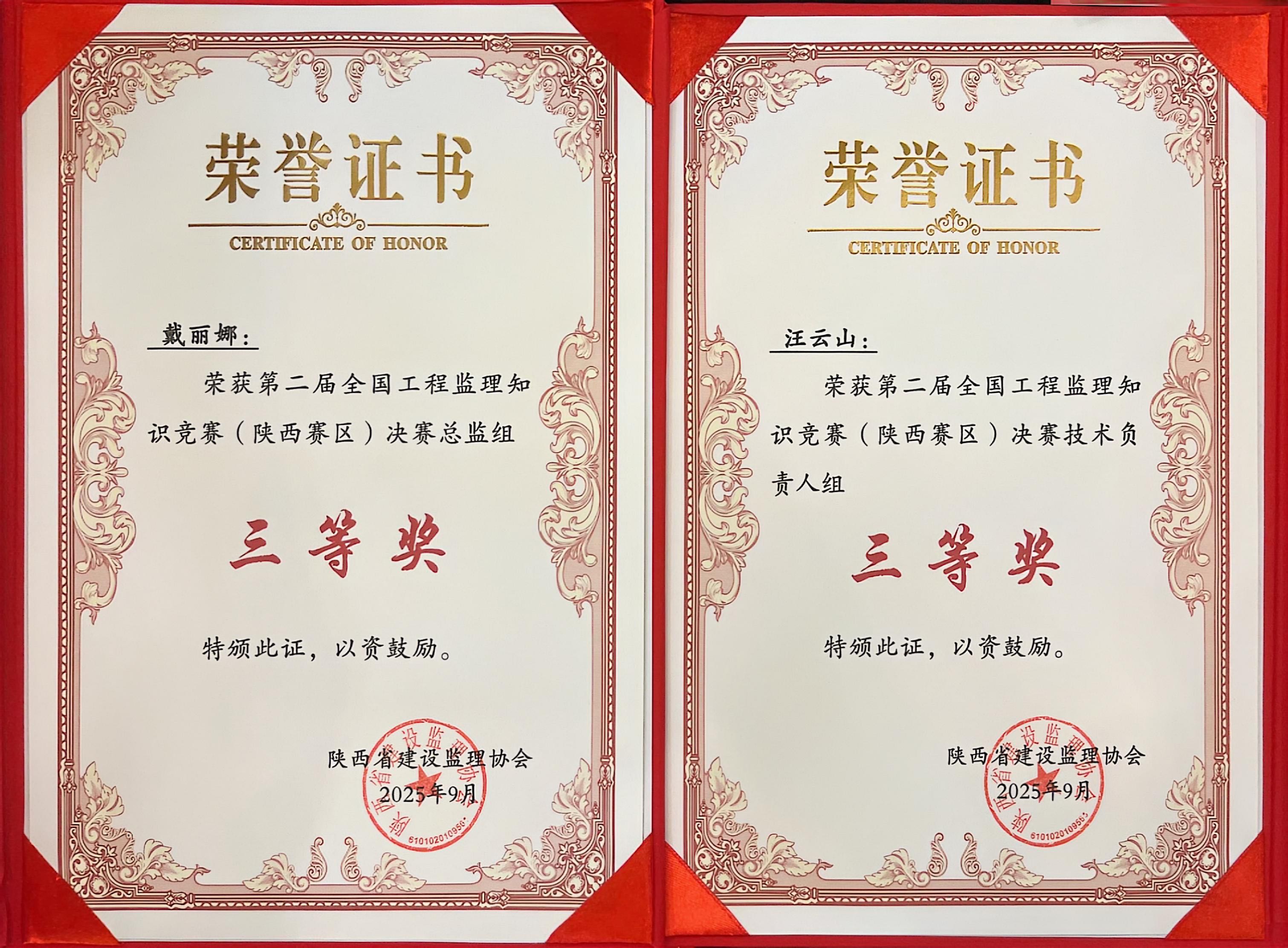 在个人奖项方面,汪云山同志荣获“技术负责人组三等奖”,戴丽娜同志荣获“总监组三等奖”,充分展现了我公司监理人员精湛的专业素养与积极进取的风貌。