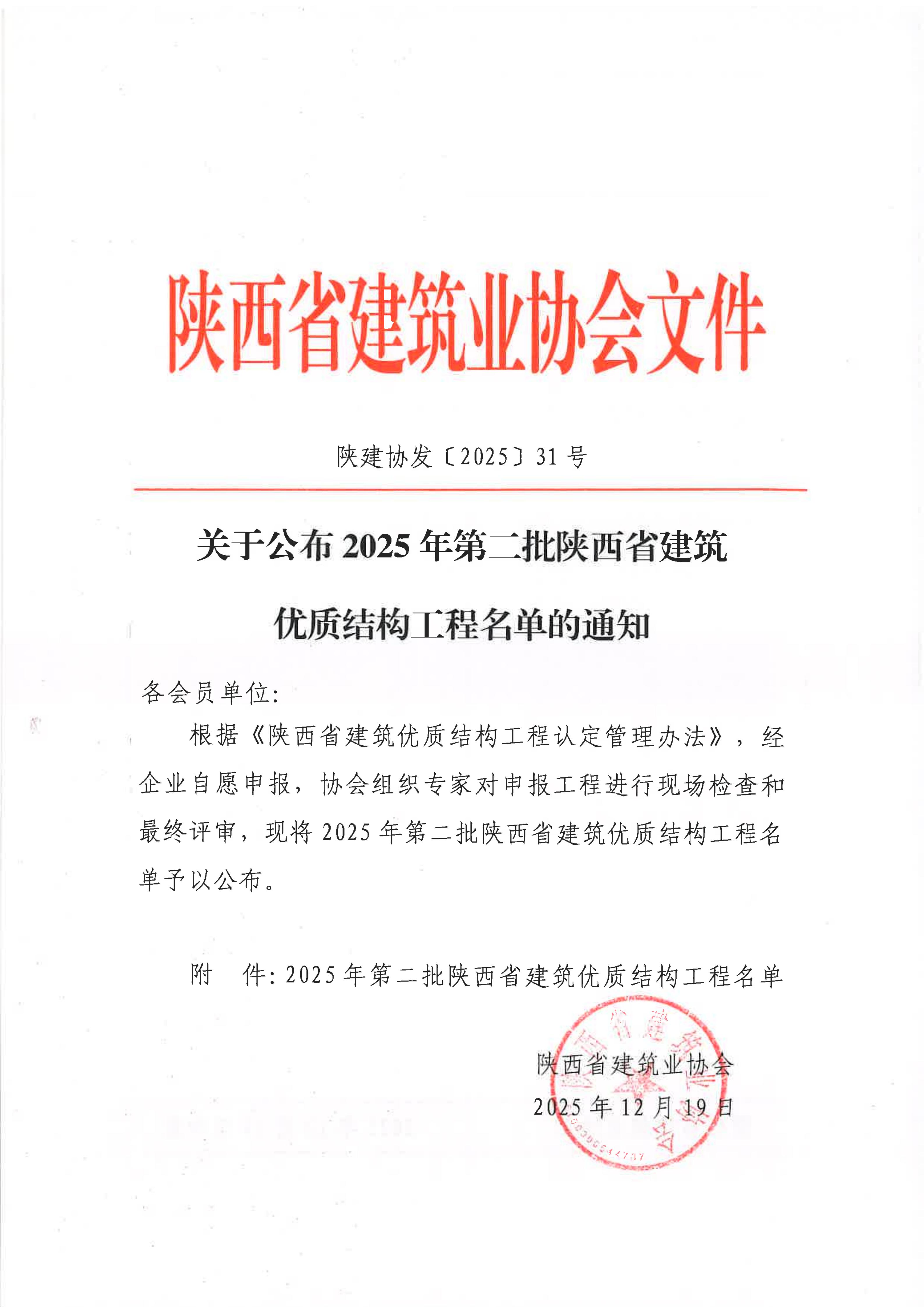 近日,陕西省建筑业协会正式公布2025年第二批建筑优质结构工程认定结果,我公司秦汉怡园坊、西安大兴渭水园生态康养项目(一期)、西安大兴渭水园生态康养项目(二期)、西安交通大学城市学院校区建设项目、未央区璟辰里建设项目(EPC)一标段、和瑞府、曲江·公园里二期一标段、西安电子谷项目AE区、未央区璟辰里建设项目(EPC)二标段(1-9#楼)、陕建·汉悦府项目三期施工Ⅰ标段项目等10个项目凭借过硬的结构质量、科学的施工管理与创新技术应用,成功获取此项省级殊荣。